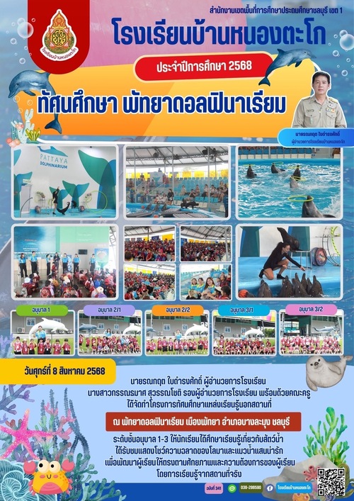 นายรณกฤต ใบดำรงศักดิ์ ผู้อำนวยการโรงเรียน นางสาวกรรณรมาศ สุวรรณโชติ รองผู้อำนวยการโรงเรียน พร้อมด้วยคณะครู ได้จัดทำโครงการทัศนศึกษาแหล่งเรียนรู้นอกสถานที่ ณ พัทยาดอลฟินาเรียม เมืองพัทยา อำเภอบางละมุง ชลบุรี