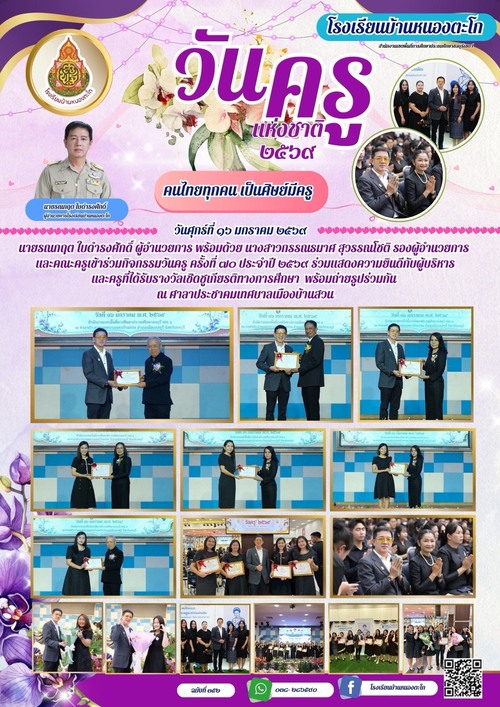 | ายรณกฤต ใบดำรงศักดิ์ ผู้อำนวยการ พร้อมด้วย นางสาวกรรณรมาศ สุวรรณโชติ รองผู้อำนวยการ และคณะครูเข้าร่วมกิจกรรมวันครู ครั้งที่ ๗๐ ประจำปี ๒๕๖๙ ร่วมแสดงความยินดีกับผู้บริหาร และครูที่ได้รับรางวัลเชิดชูเกียรติทางการศึกษา พร้อมถ่ายรูปร่วมกัน ณ ศาลาประชาคมเทศบาลเมืองบ้านสวน |